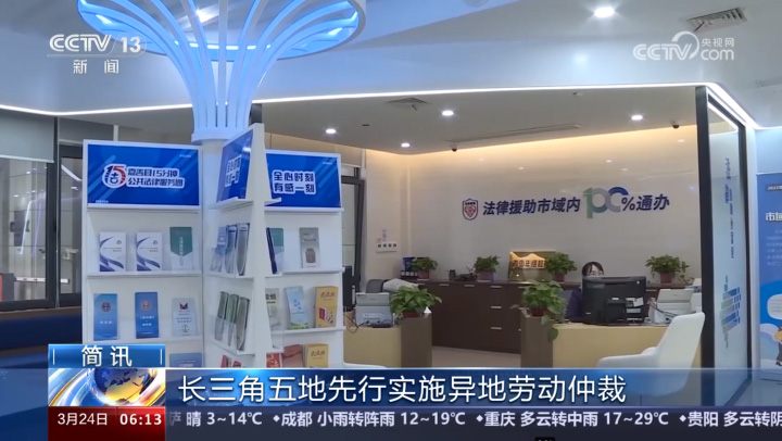 同日,中央广播电视总台新闻频道《朝闻天下》播出《长三角五地先行实施异地劳动仲裁》。